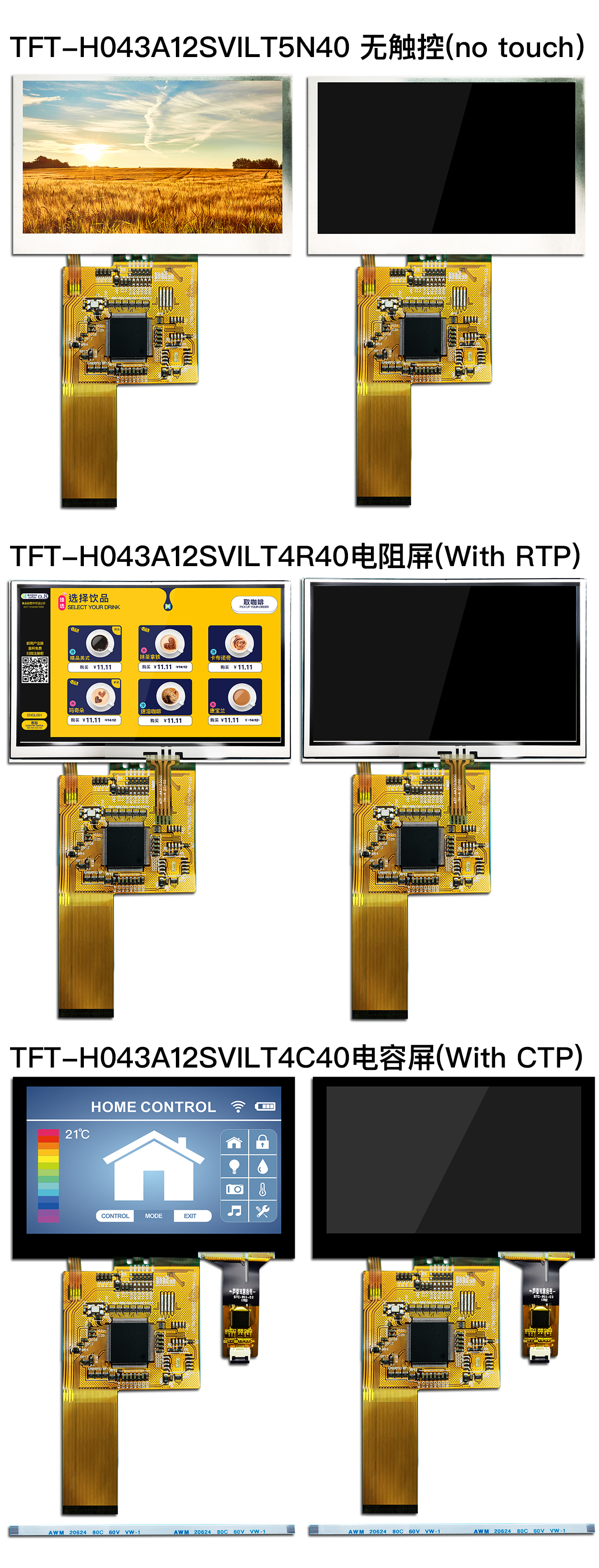 H043A12SVILT5N40是一款4.3寸超廣溫IPS-TFT搭載投射電容式觸控面板(PCAP)顯示器模塊,分辨率為800x480像素。模塊內(nèi)建ST7262+HT7381(TFT),驅(qū)動(dòng)器IC,支持MCU接口。 H043A12SVILT5N40采用IPS面板技術(shù)具有廣視角左:80 / 右:80 / 上:80 / 下:80度 (典型值);高對(duì)比度度800:1(典型值),亮度400 nits(典型值),模塊采用亮面玻璃,屏幕長(zhǎng)寬比為16:9。此款搭載的電容式觸控面板內(nèi)建GT911(CTP) IC,支持I2C接口,支持多點(diǎn)觸控功能。 H043A12SVILT5N40電源電壓 (VCC) 為3.0V至~3.6V,典型值為3.3V,模塊工作溫度為-30℃~+80℃,儲(chǔ)存溫度為-30℃~+80℃。此外,H043A1型號(hào)同時(shí)提供無(wú)觸控選項(xiàng),產(chǎn)品料號(hào)為H043A12SVILT5N40。