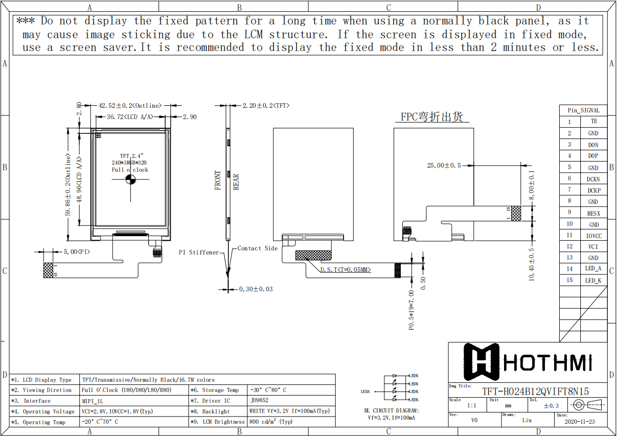 TFT-H024B12QVIFT8N15是HOTLCD研發(fā)團隊精心設(shè)計的2.4英寸TFT彩色液晶屏,240*320分辨率,高畫質(zhì),廣視角,65K/262K真彩,內(nèi)置JD9852控制器,支持MIPI接口,無需外圍電路,15PIN插件FPC可接主板(可選連接器),單電源DC 3.2V供電。 該TFT模組可配備觸摸屏,所有材料均符合RoHS環(huán)保要求標(biāo)準(zhǔn)。 廣泛應(yīng)用于各種儀表、智能設(shè)備、分析儀器、手持儀表、行車記錄儀等:8051、PIC、AVR、ARDUINO、ARM、樹莓派等。