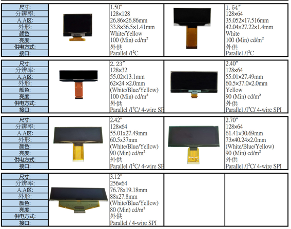 1.32寸OLED、1.50寸OLED、1.54寸OLED、2.23寸OLED、2.40寸OLED、2.42寸OLED、2.70寸OLED、3.12寸OLED